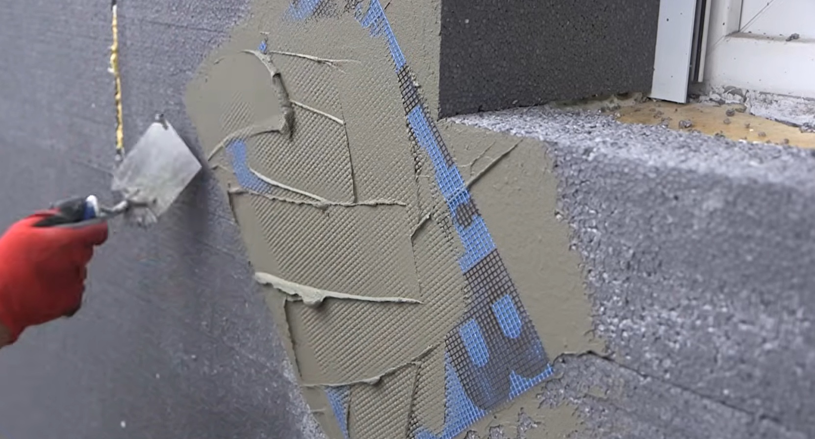 vytvorenie výstužnej vrstvy – lepidlo so sklotextilnou sieťkou, rohovými a okennými profilmi,